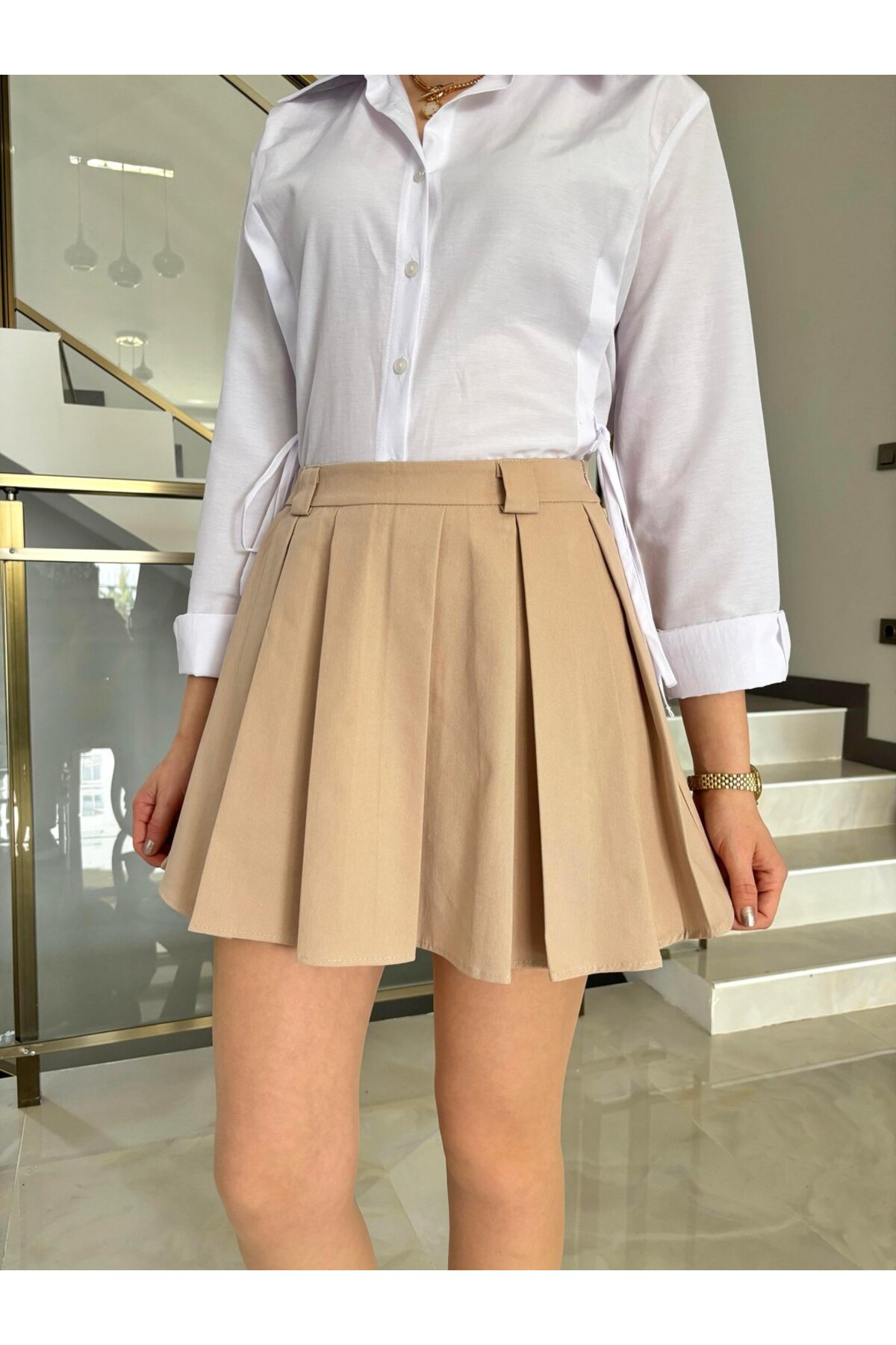 Butik Bej Pileli Mini Etek Özellikleri