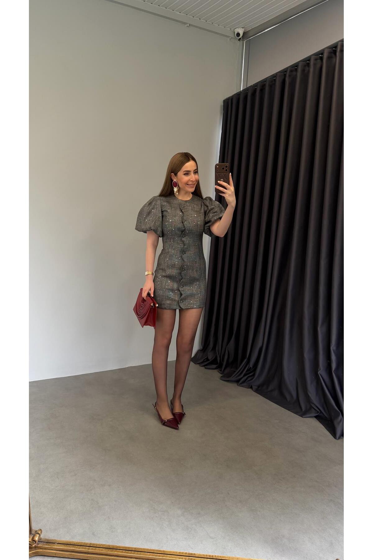 elif teke Kopi Pullu Elbise Gri