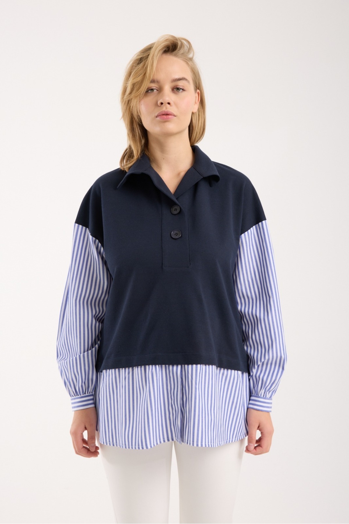 Entarim HAMİLE GÖMLEK YAKA ÖRME ÇİZGİLİ TUNİK