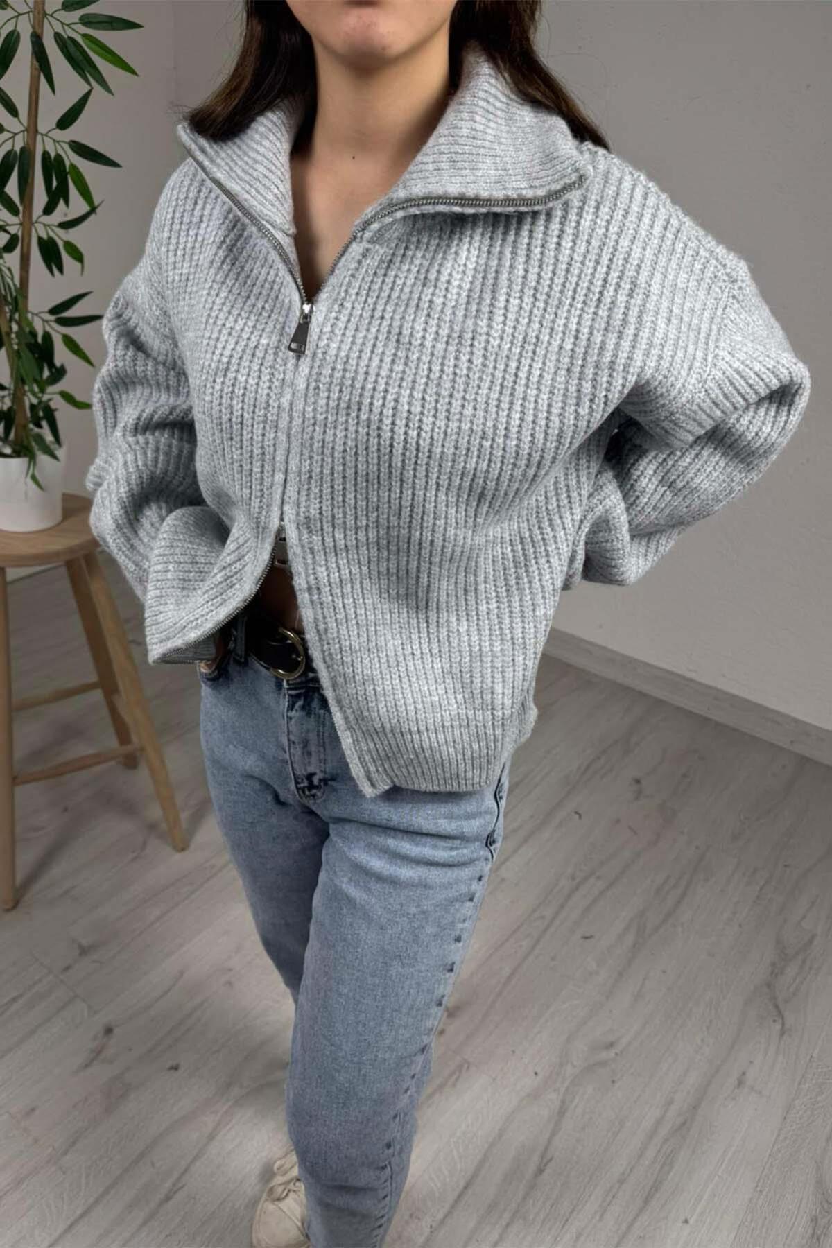EXPLODE - Kadın Premium Gri Çift Fermuarlı Overisize Triko Kazak Özellikleri