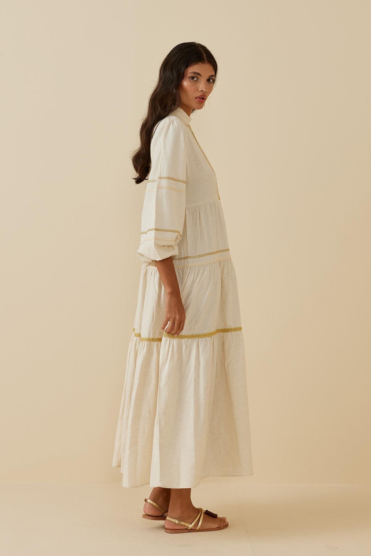 Fahhar Çok Şeritli Keten Elbise Bej