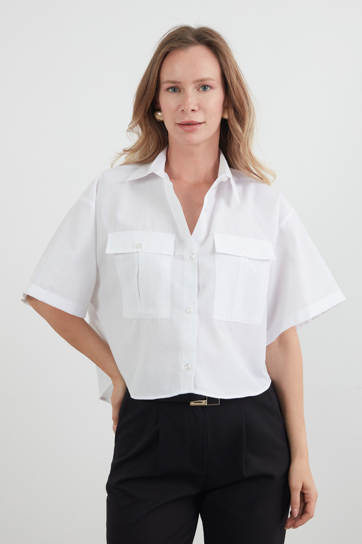 Fullamoda Basic Çift Cepli Arkası Uzun Crop Gömlek