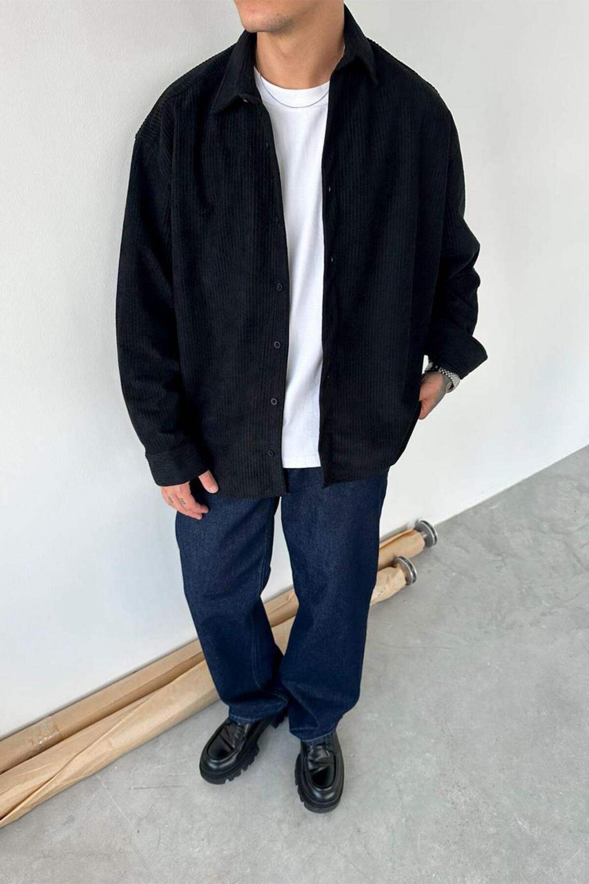 hafkagiyim Siyah Basic Fitilli Kadife Gömlek