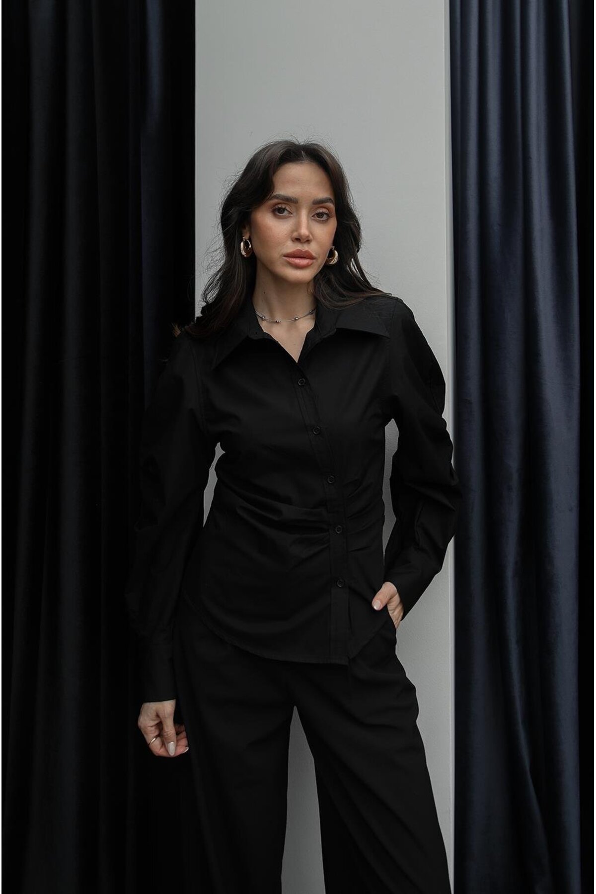 Havoş Siyah Çapraz Düğmeli Drapeli Gömlek Özellikleri