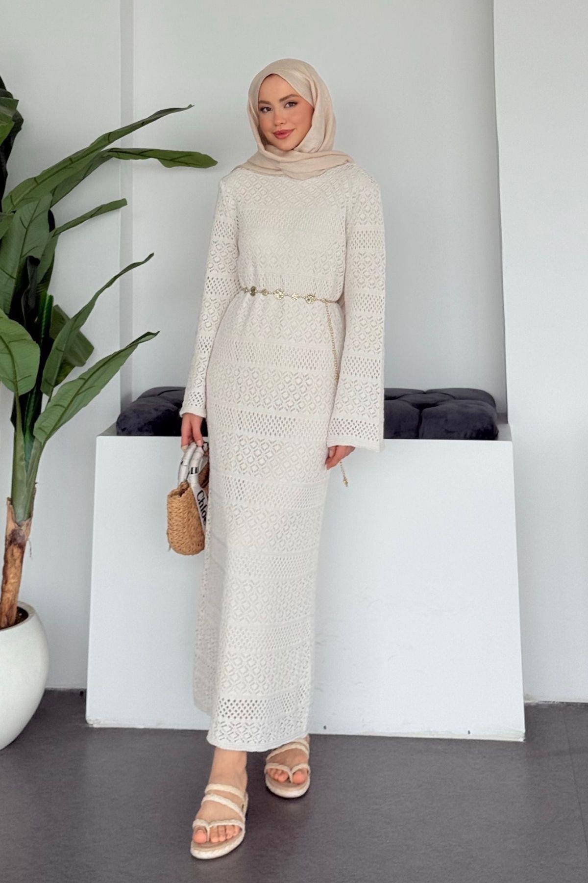 Hazamoda Ajur Örme Elbise Krem