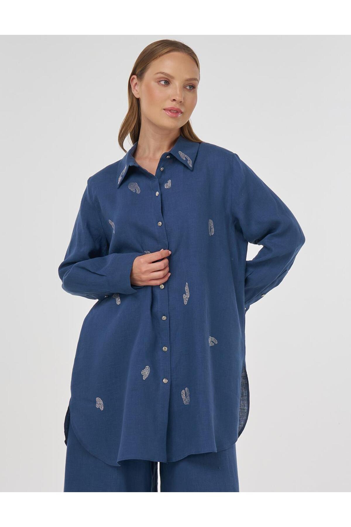 Kayra %100 Keten Hotfix Baskılı Tunik İndigo