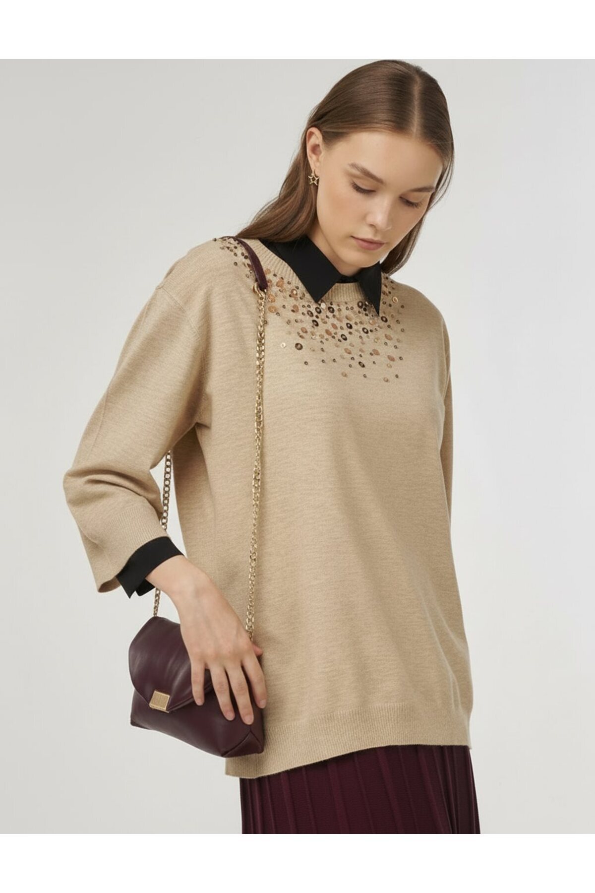 Kayra Payet İşlemeli Viskon Triko Tunik Vizon