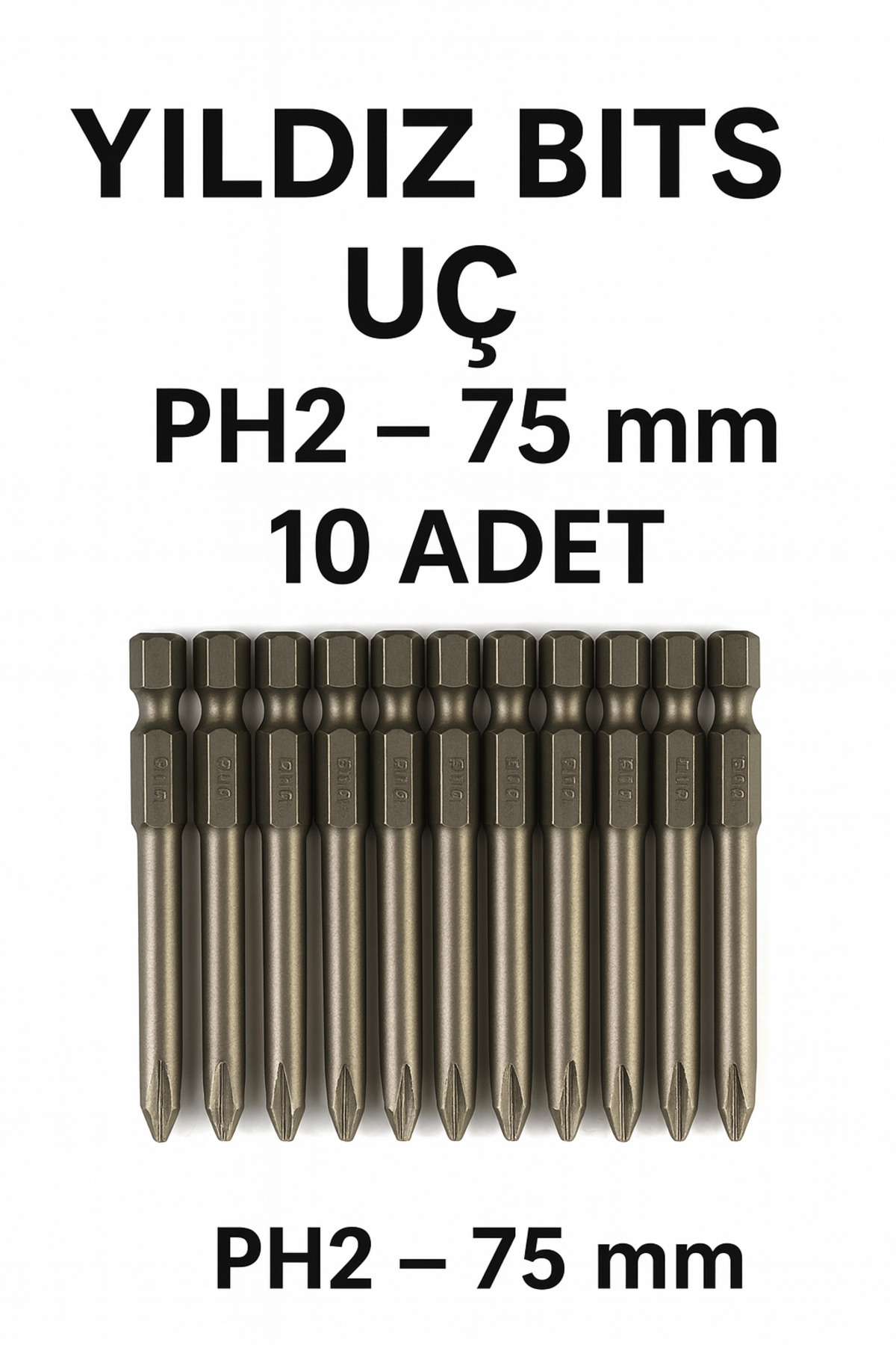 MertTools Yıldız Bits Uç PH2 75 mm – Vidalama Bits Ucu Seti S2 Çelik 10 Adet