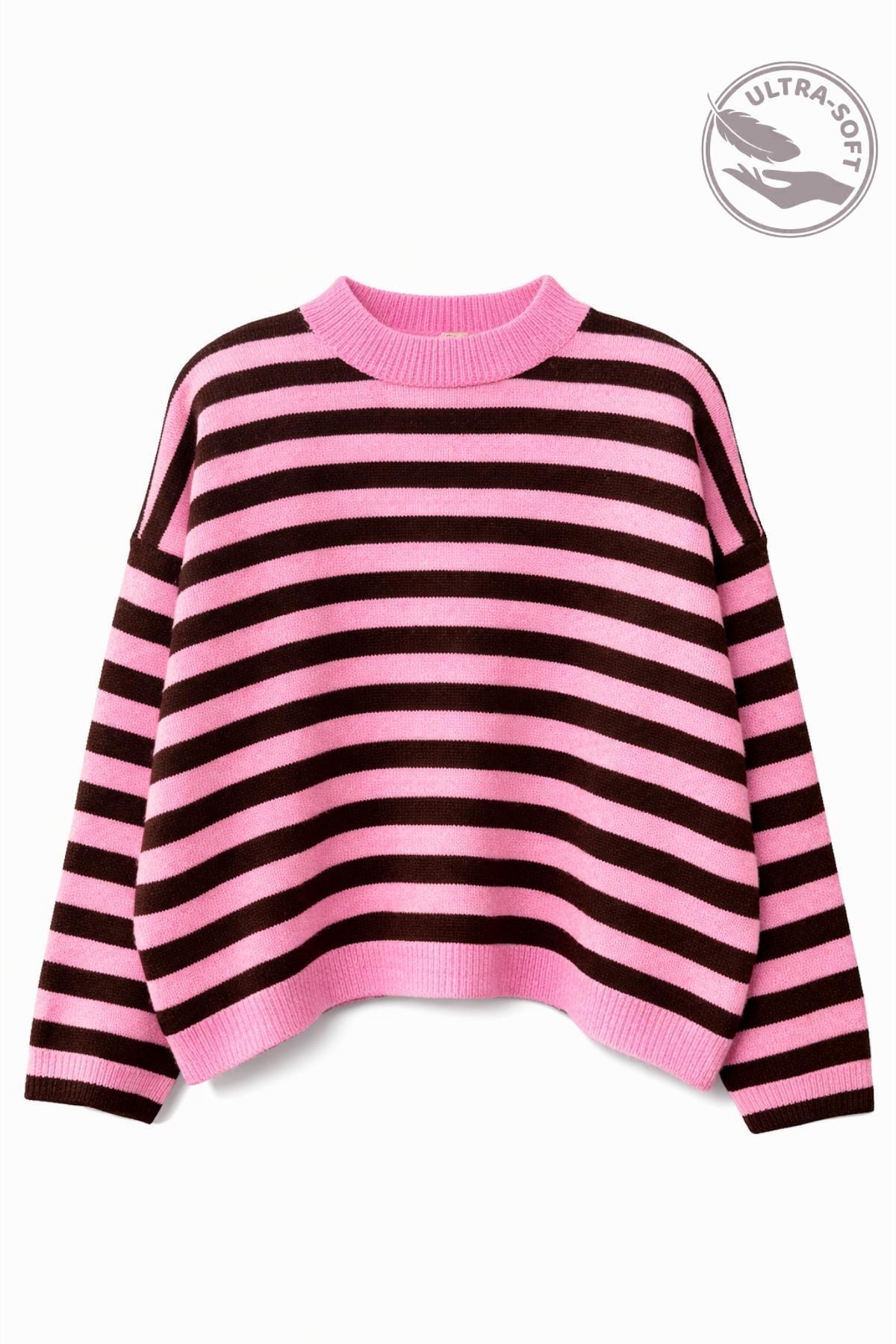 Mixray 7016 Kadın Çizgili Oversize Basic Triko Kazak Pembe