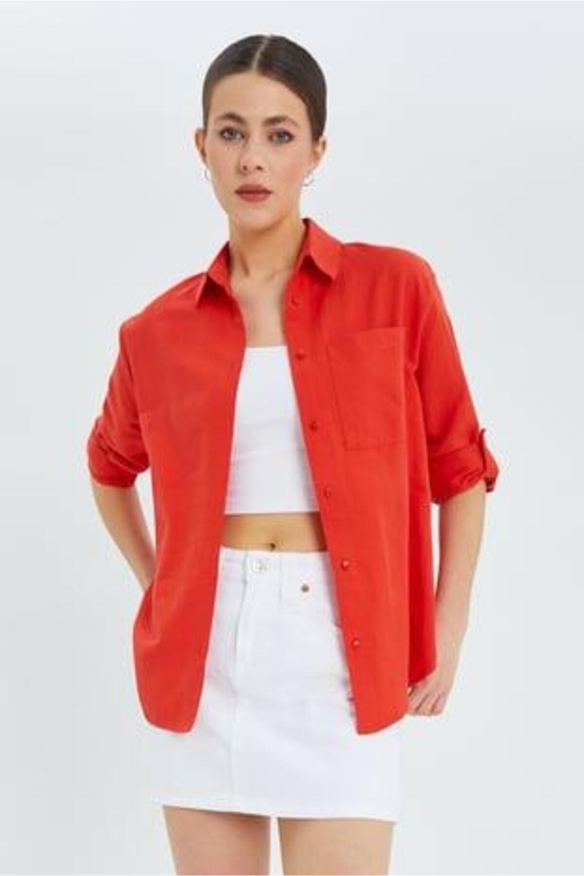 Mixray 9942 Kadın Oxford Uzun Kol Basic Gömlek Nar