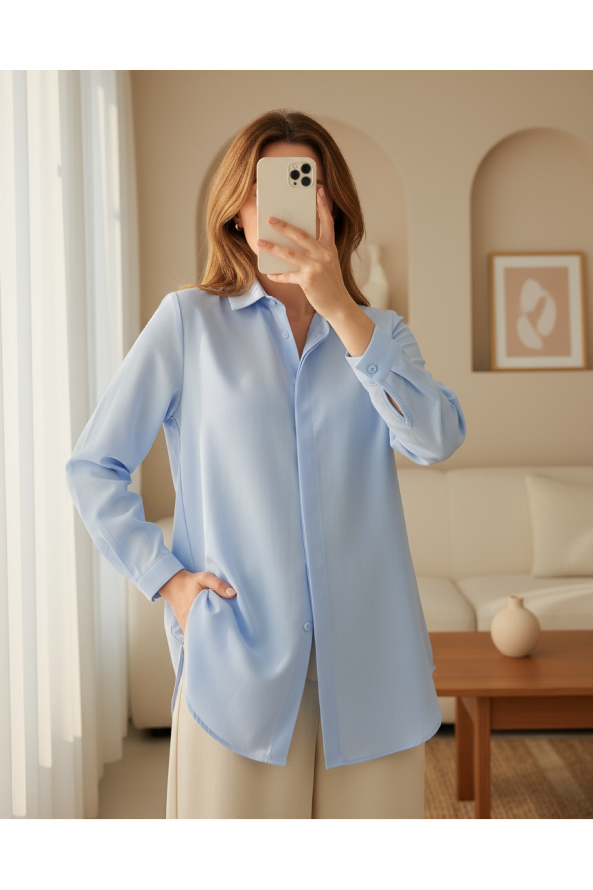 Modamorfo Gizli Düğmeli Oval Kesim Uzun Gömlek -Bebe Mavi Özellikleri