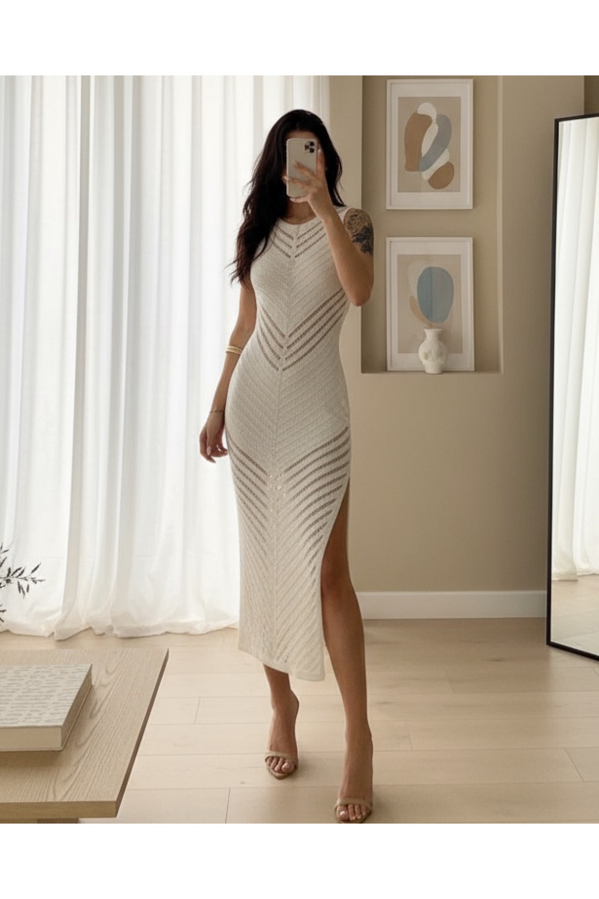 Modamorfo Merserize Şerit Yırtmaçlı Triko Elbise -Ekru
