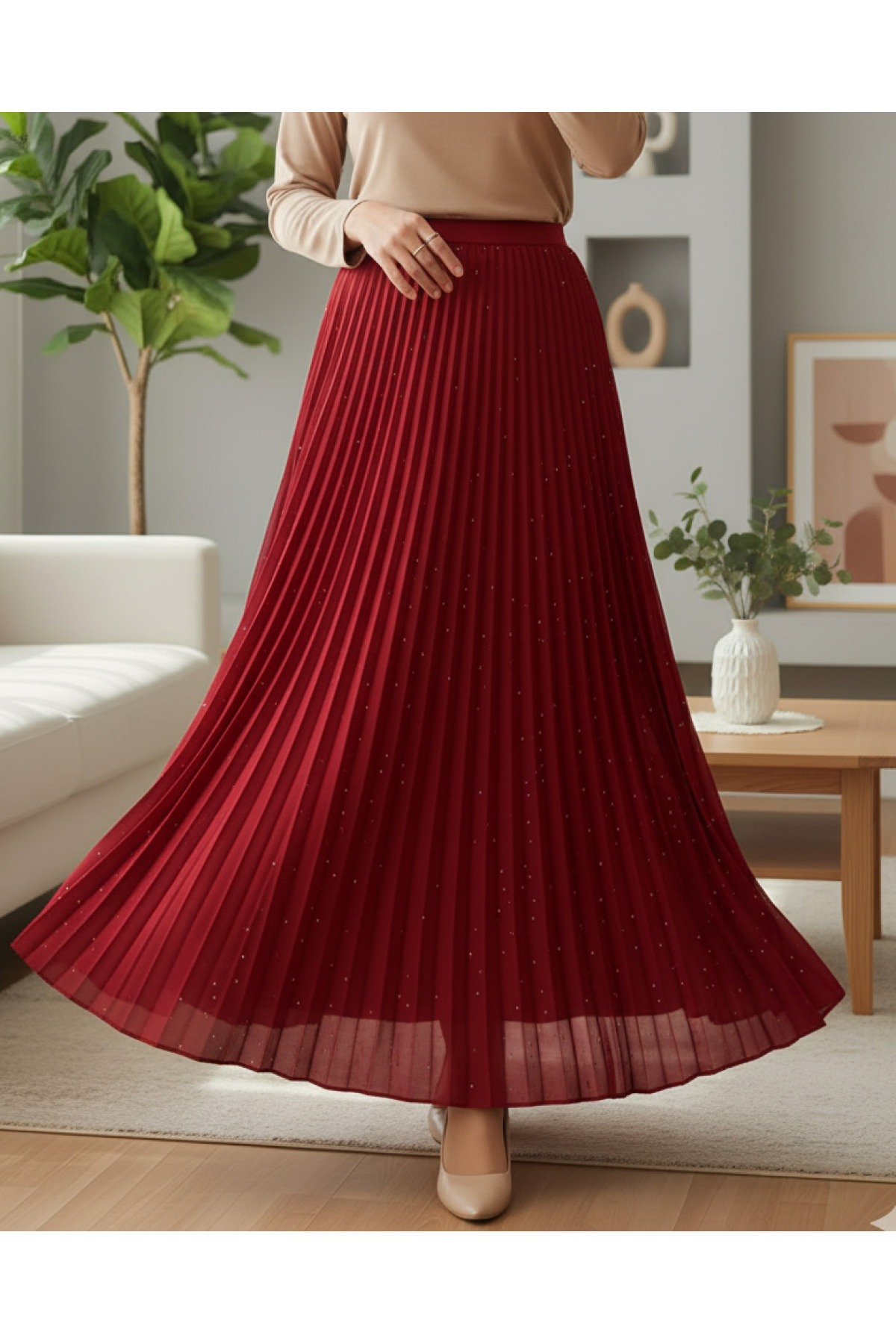Modamorfo Taşlı Pliseli Etek -Kırmızı Özellikleri