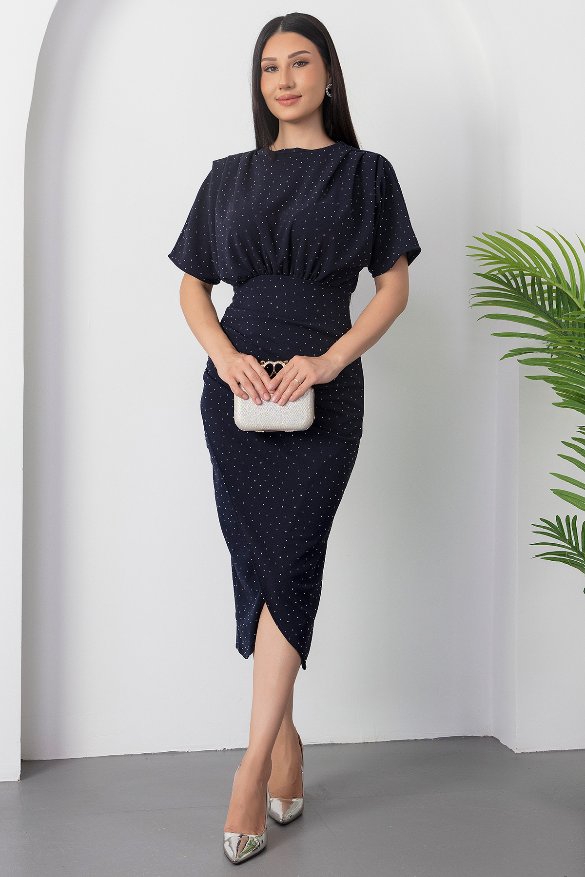 PULLIMM Bisiklet Yaka Taşlı Yırtmaçlı Elbise DKS1313 Özellikleri