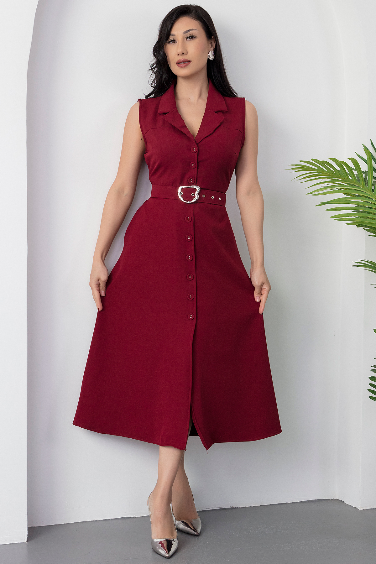 PULLIMM Boydan Düğmeli Yakalı Kemerli Elbise DKS1124 Özellikleri