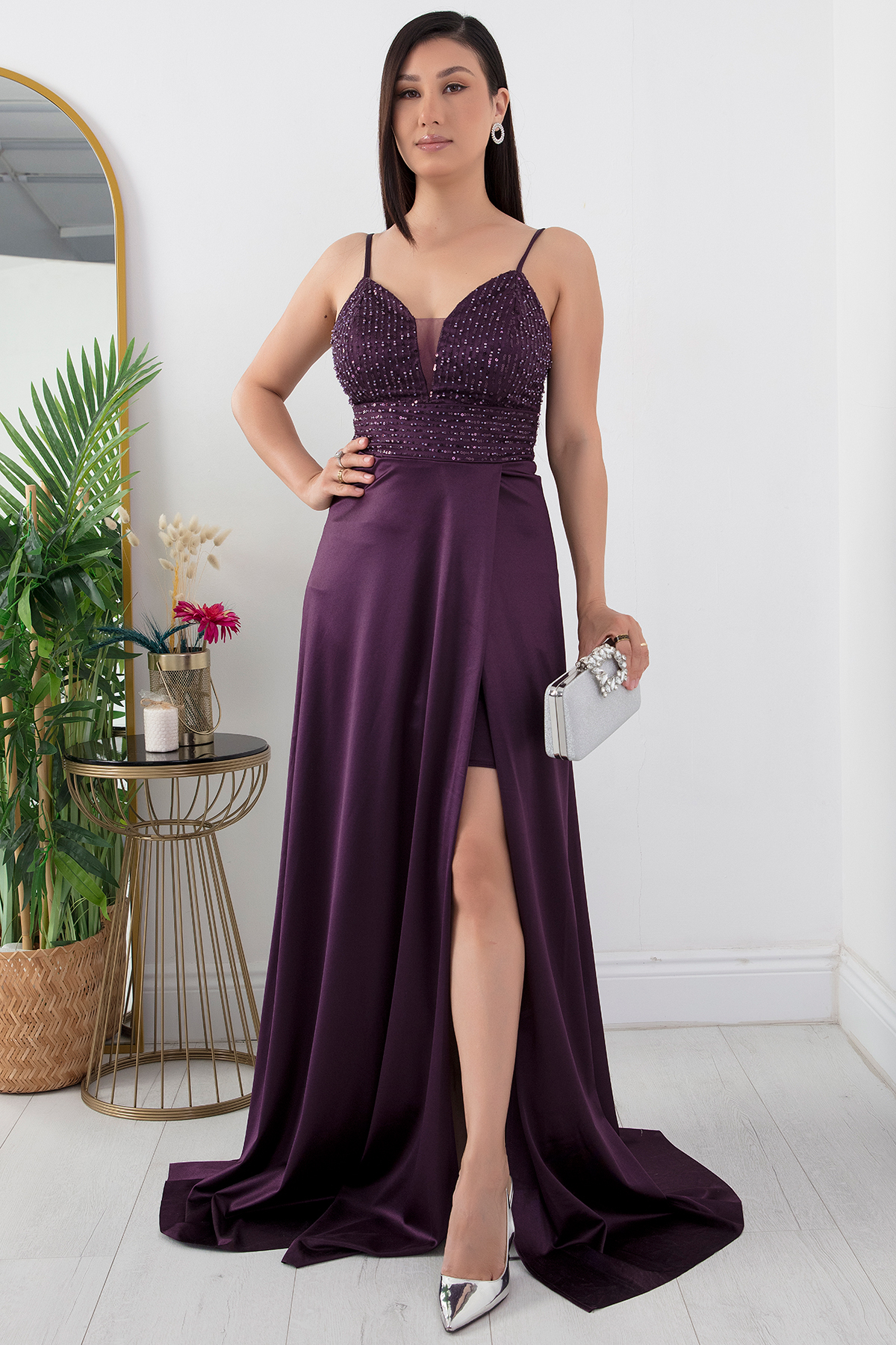 PULLIMM Göğüs Pullu Askılı Saten Elbise 39885 Özellikleri