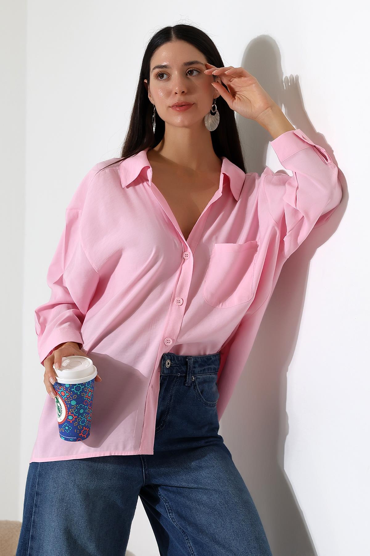 ribana Tek Cep Modal Oversize Kadın Gömlek