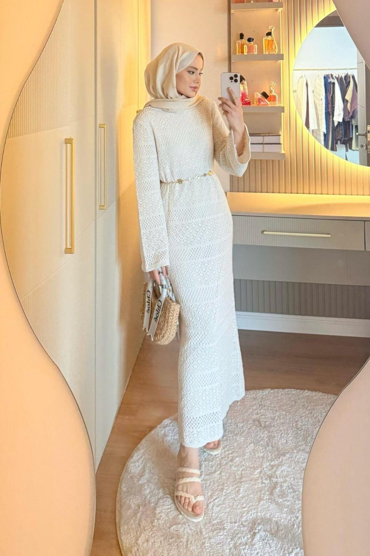 Şulemoda Giyim Ajur Örme Elbise Ekru