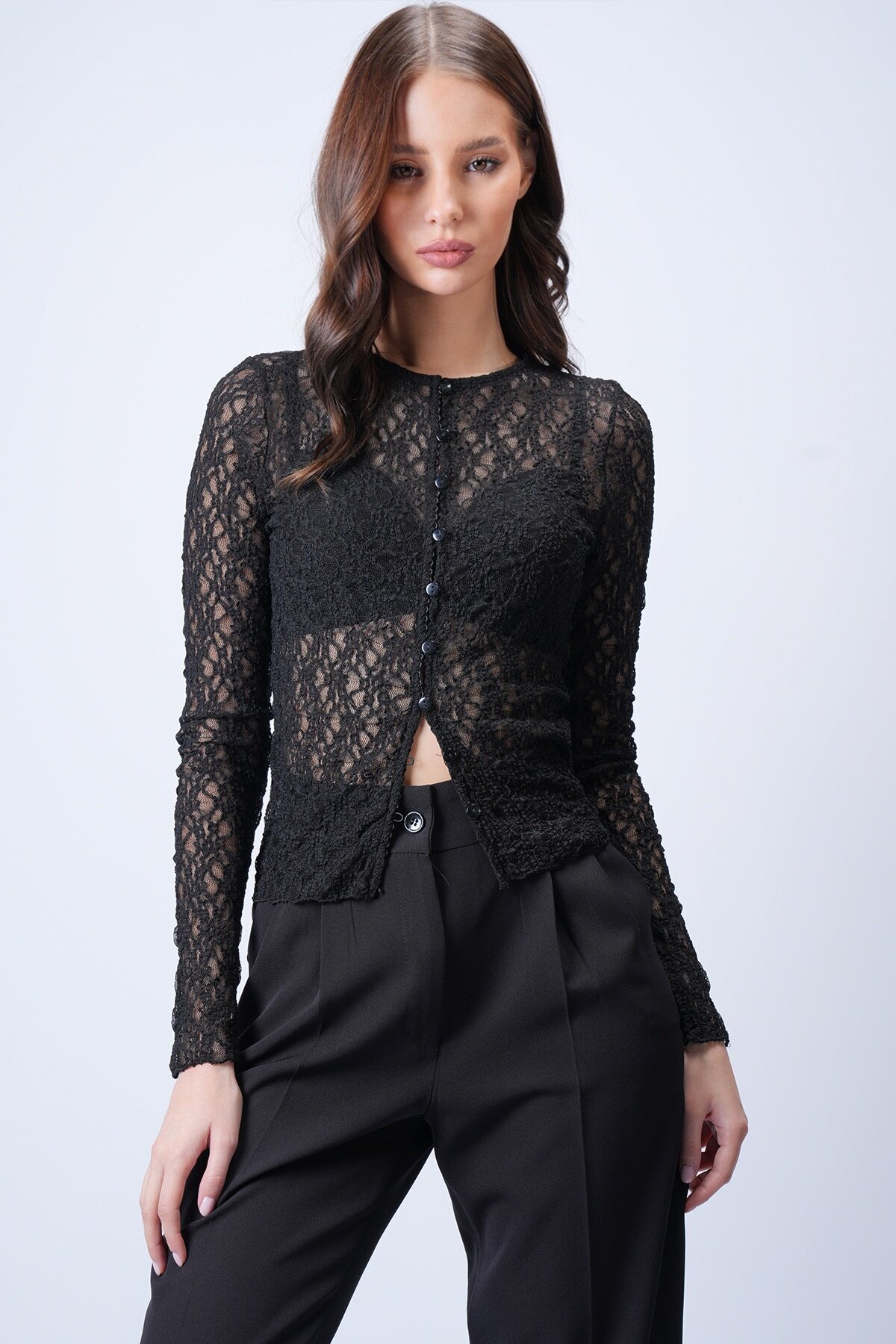 VAGGON Siyah Düğmeli Dantel Bluz